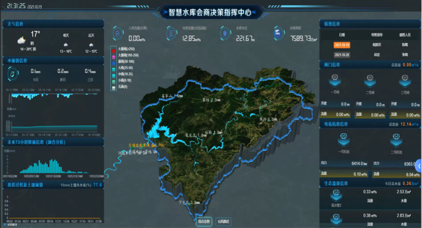 基于水库2.5维立体GIS地图,结合水库实时监测数据、洪水预报成果,构建水库会商决策大数据可视化平台,为水库领导提供科学的调度会商决策支持。