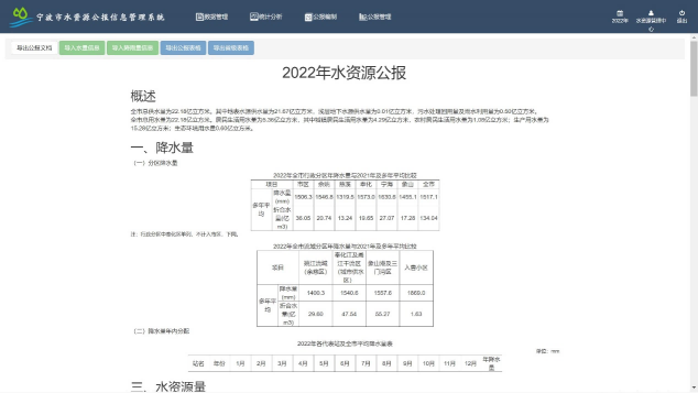面向宁波市水资源公报信息管理及公报编制工作,打造水资源公报系统,实现对公报数据的一体化存储、查询、审查、统计分析,实现水资源公报在线化编辑、发布、管理。2017年系统建成以来,持续支撑了每个年度的水资源公报编制工作,极大程度提高了水资源公报的编制效率。