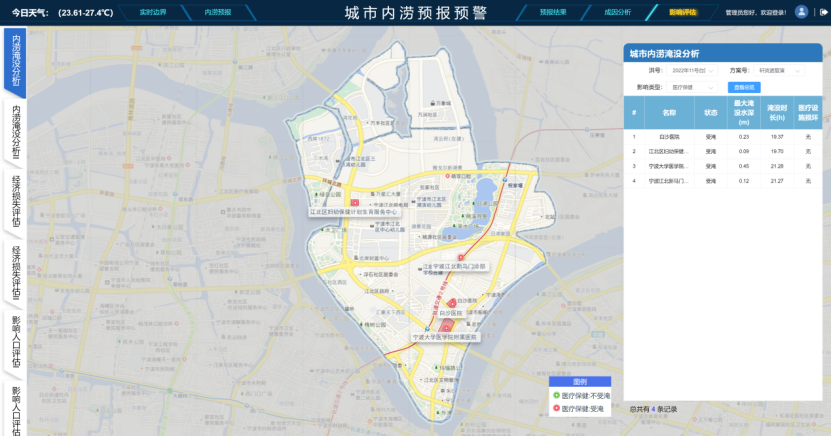 系统以内涝损失影响评估模型为技术手段,叠加运用于内涝灾害模拟结果图层、行政区划图层及区域社会经济特征图层,可实现对暴雨内涝情景下各产业的经济损失评估,各社区的影响人口评估,各保护对象的淹没影响分析及灾情统计分析功能,辅助相关部门依据损失影响评估结果采取针对性灾害防御策略。