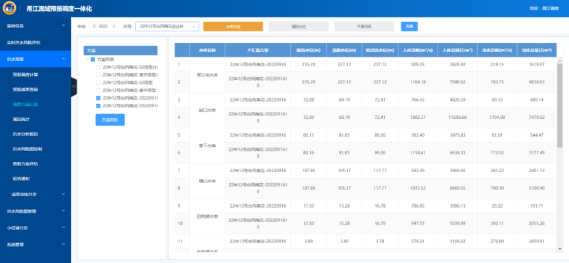 针对领导决策层调度会商的业务需求,以预报调度一体化计算模型为基础,对流域内各水利工程调度规则及各联合调度规则下水库、堤防、平原河网三类对象的计算结果进行横向对比分析,为当前实时调度提供方案多维优选功能,并以可视化手段将方案对比结果直观地展示给用户。